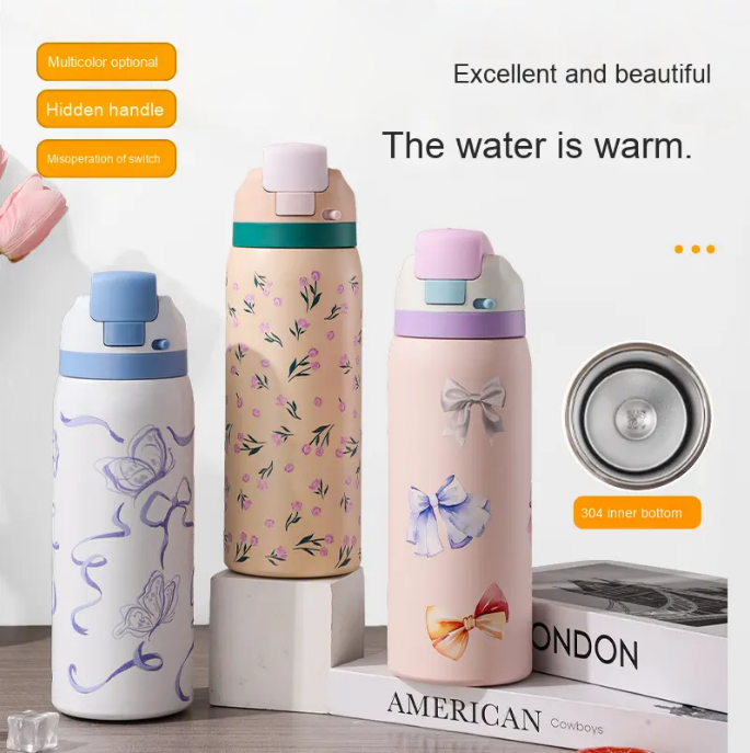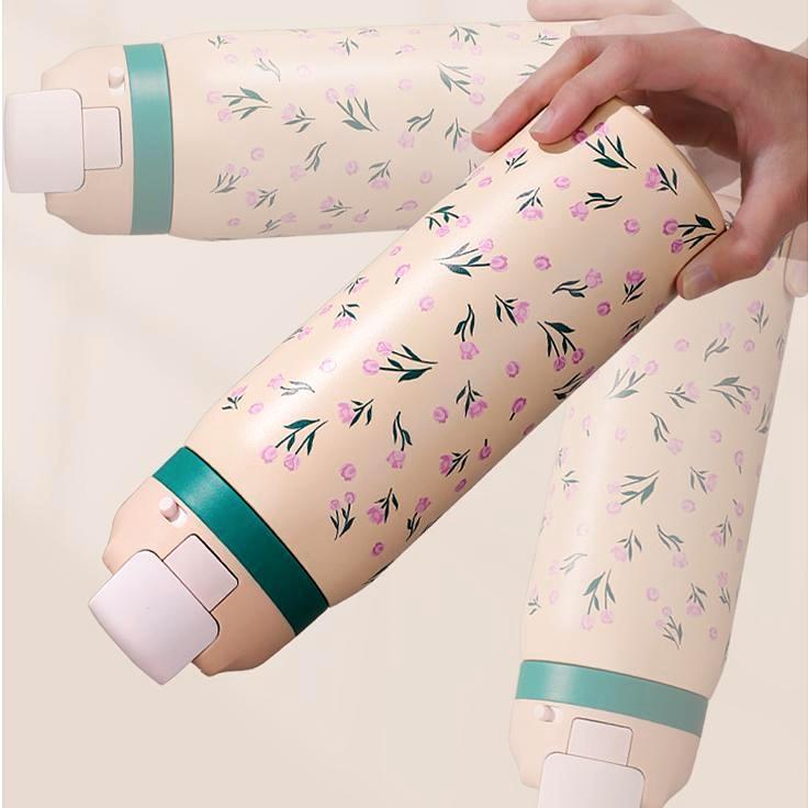 This stylish portable insulated water bottle integrates aesthetic floral & bow designs with practical functions, making hydration a delightful experience for daily life, work, school, or travel.